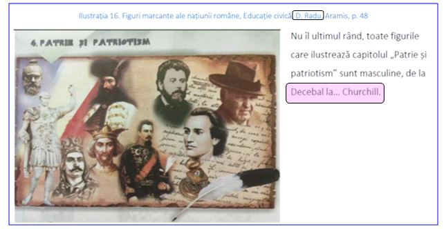 Adică defectul nr.1 al ”creațiunii” lui D. Radu ar fi… misoginismul: Nu în ultimul rând, toate figurile care ilustrează capitolul „Patrie și patriotism” sunt MASCULINE…